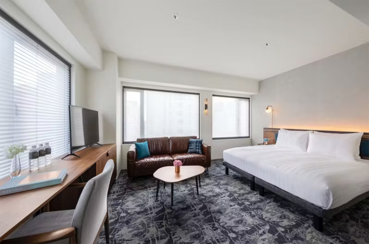 다양한 여행자의 니즈를 만족시키는 7개의 퍼블릭 공간이 마련된 더 라이블리 오사카 혼마치는 혼자 여행하는 성인 여성에게도 감각적인 경험을 선사하는 매력적인 오사카 숙소입니다. 총 174개의 객실은 간접조명을 활용한 세련된 조명 디자인으로 꾸며져, 일상에서 벗어난 프라이빗한 분위기를 연출합니다. 일부 객실에는 빔프로젝트도 있어 영화나 유튜브 등도 볼 수 있는 것도 좋습니다.